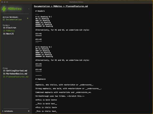 MdNotes is a desktop markdown note-taking app that allows you to create, edit, and delete notes. It is built using React and TypeScript, and it uses local storage to save your notes. All notes are sorted as if you were using a binder (i.e. Notebook > Folder > Page). This project was built using React, TypeScript, and Electron.